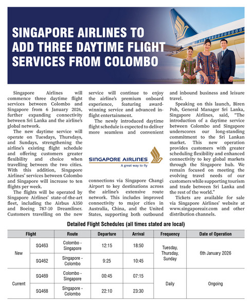 Singapore Airlines commenced three daytime flight services between Colombo and Singapore from 6 January 2026, further expanding connectivity between Sri Lanka and the airline’s global network.