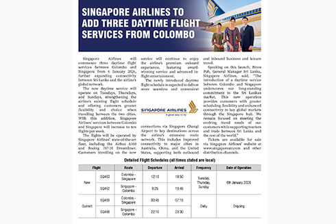 Singapore Airlines commenced three daytime flight services between Colombo and Singapore from 6 January...